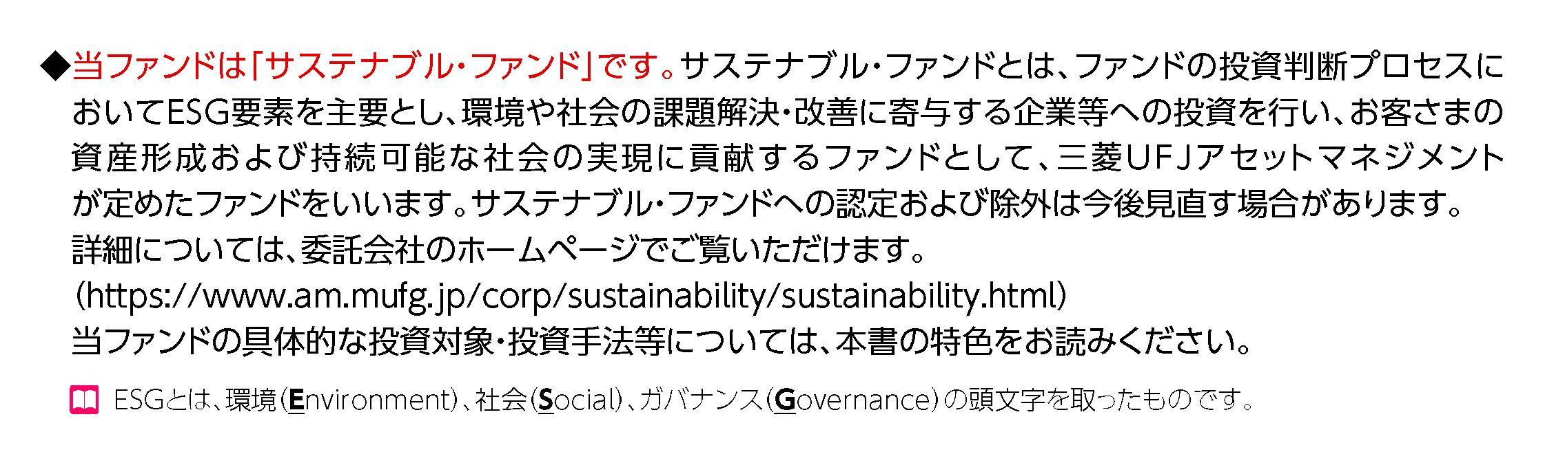 三菱UFJアセットマネジメントは、投資判断プロセスにおいてESG要素を主要とし、環境や社会の課題解決・改善に寄与する企業等への投資を行い、お客さまの資産形成および持続可能な社会の実現に貢献するファンドを「サステナブル・ファンド」として定義しています。お客さまに「サステナブル・ファンド」であることを分かりやすくご確認いただけるよう、該当ファンドの目論見書の表紙裏にその旨を記載しています。