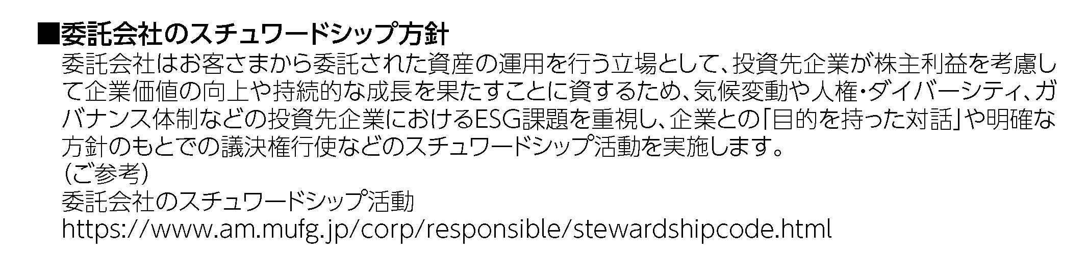 また当社は、責任ある機関投資家として、適切に受託者責任を果たすため、「責任ある機関投資家」の諸原則「日本版スチュワードシップ・コード」を受入れております。サステナブル・ファンドではそれらを明示するため、委託会社のスチュワードシップ方針を掲載しています。