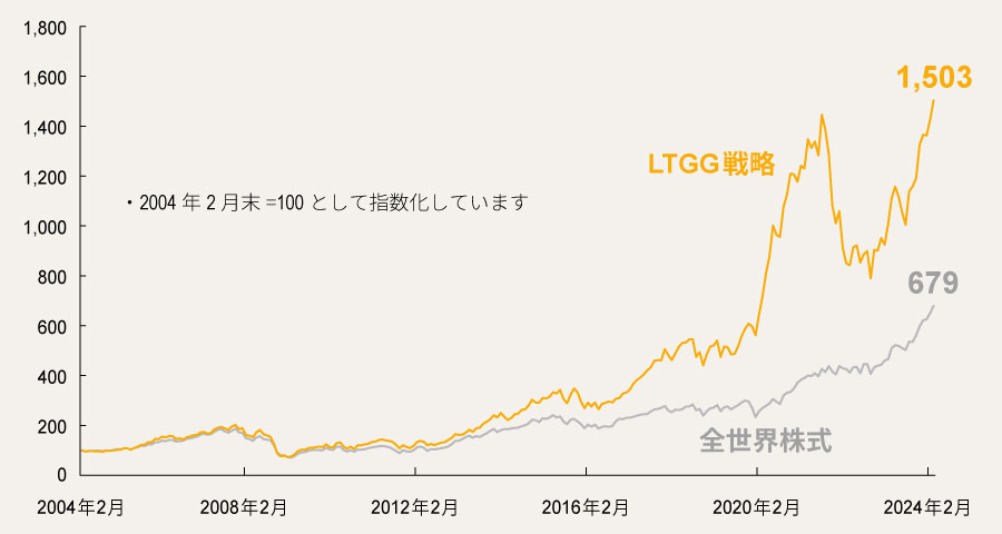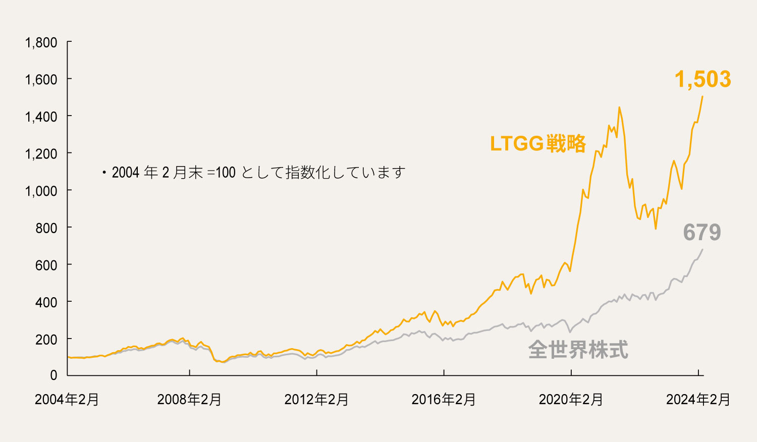 ・上記では、代表的な指数の中で、LTGG戦略の投資対象の性質を表すのに、運用チームが相応と考える全世界株式と比較しています。全世界株式は、MSCI オールカントリー・ワールド インデックス(税引き後配当込み米ドルベース)をもとに委託会社が円換算したものです。全世界株式は当ファンドのベンチマークではありません。