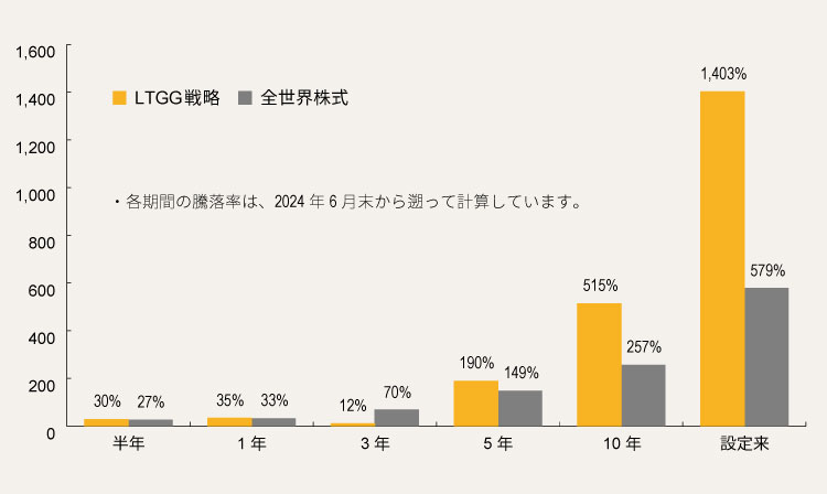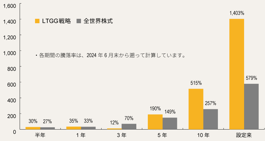 ・上記では、長期の運用実績をお示しするためLTGG戦略の代表ファンドのデータを用いています。代表ファンドは、当ファンドの投資対象ファンドと同様の運用プロセスを用いておりますが、当ファンドおよび当ファンドの投資対象ファンドの運用実績ではありません。また、それぞれの将来の成果を示唆・保証するものではありません。