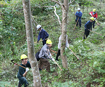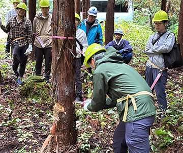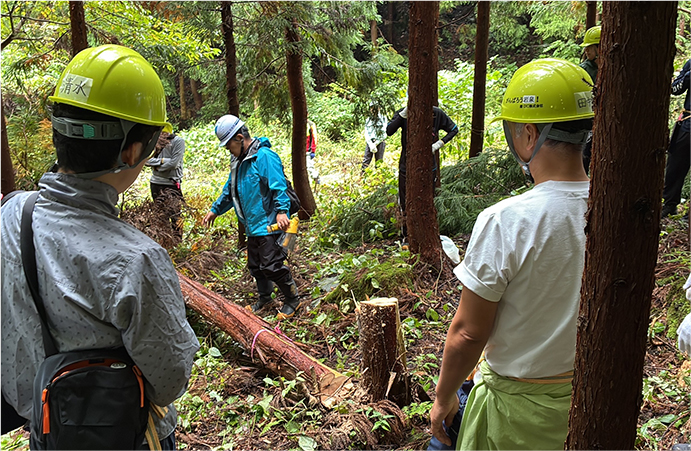 ノコギリやナタを使って、痩せた木や曲がった木を伐採し、健康な木の根元まで日光が届くようにします。木を倒す際には、3人がかりで押すなど、複数人での協力作業が必要です。